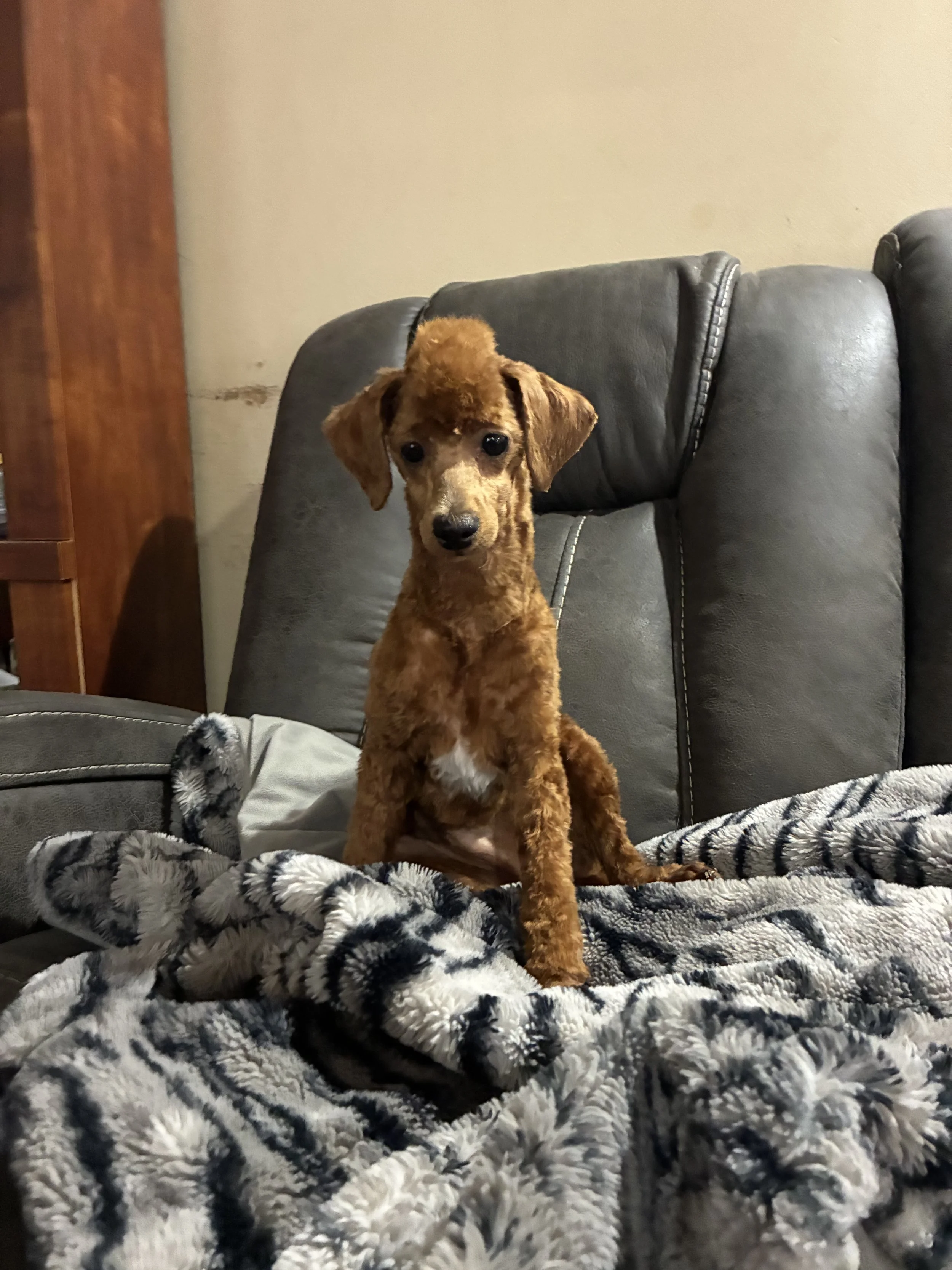 Fozzy is a 2 year old AKC registered brown base apricot abstract mini poodle. He is a low energy, low drive, love bug. Current height/weight: 13 inches, 13 pounds. He is available to a Guardian home. Pedigree